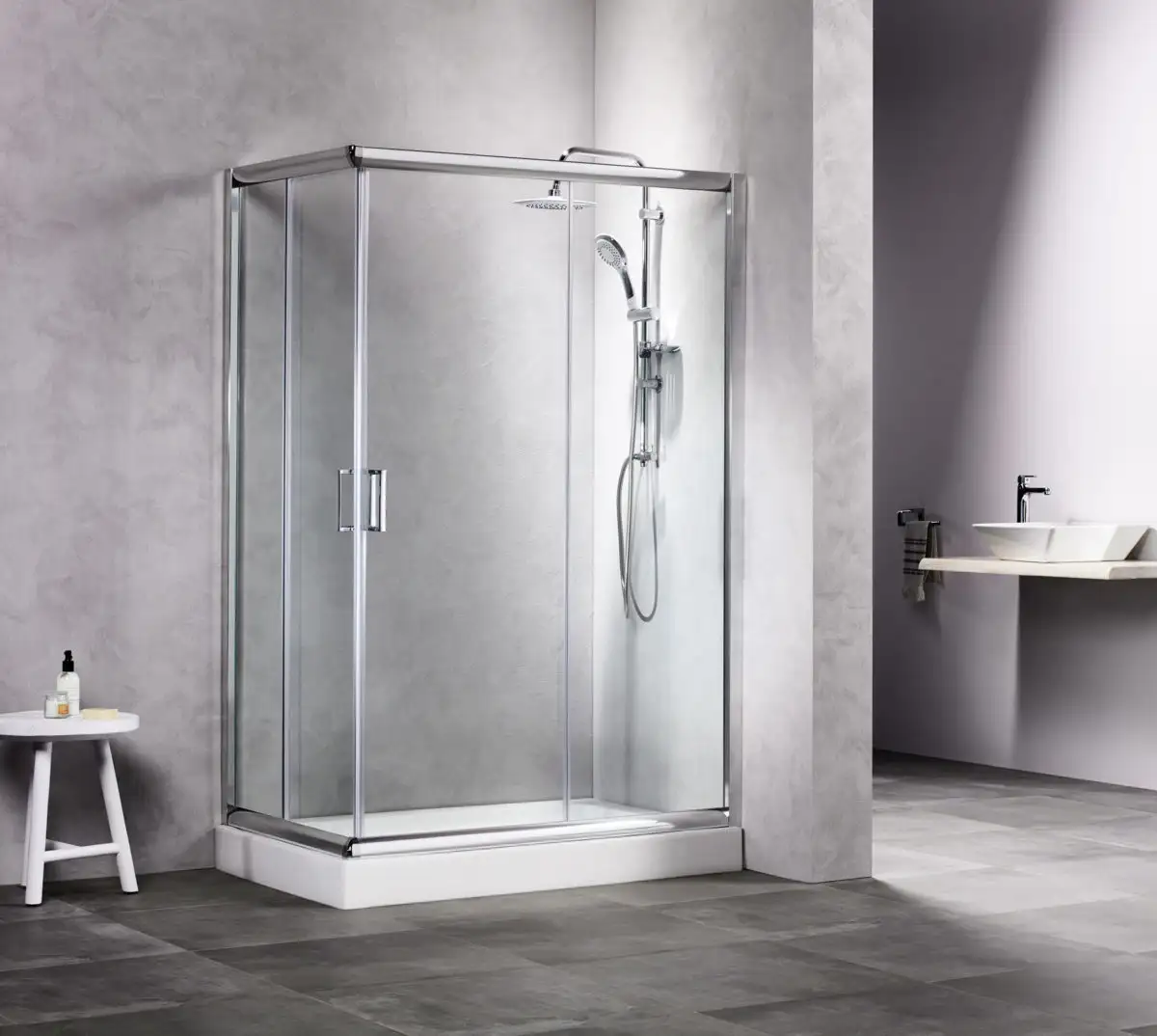 Παραλληλόγραμμη καμπίνα ντουσιέρας ειδικής διάστασης με διάφανο κρύσταλλο ασφαλείας και χρωμέ προφίλ – ιδανική για μπάνια με απαιτητική γεωμετρία