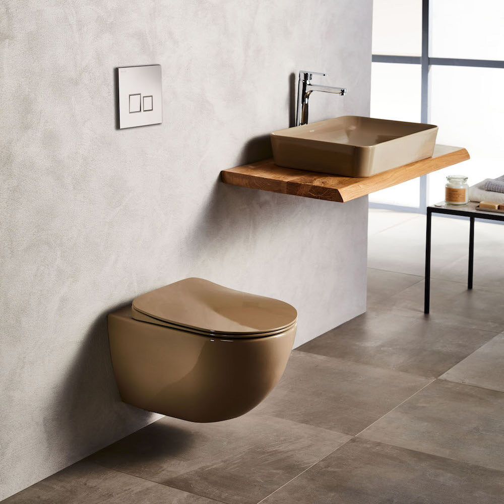 Κρεμαστή λεκάνη Free FE 320 CM Rimless σε μοναδική απόχρωση Cappuccino Matt, που συνδυάζει τη μοντέρνα αισθητική με την κορυφαία υγιεινή.