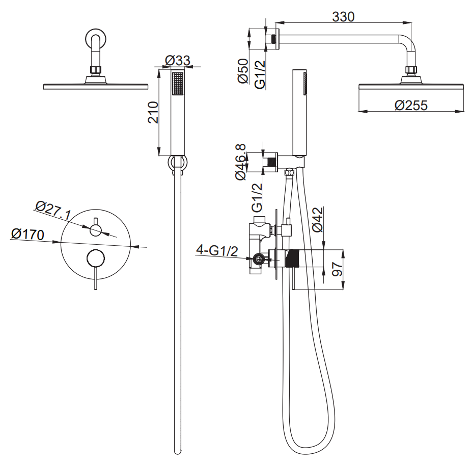 XEN 16010 N ΣΕΤ ΕΝΤΟΙΧ. ΜΕ ΜΙΚΤΗ 2 ΕΞΟΔΩΝ-ΒΡΑΧΙΟΝΑ-ΚΕΦΑΛΗ-ΠΑΡΟΧ-ΤΗΛ-ΣΠΙΡΑΛ BLACK MATTXEN 16010 N SHOWER KIT WITH 2 WAY MIXER, SHOWER ARM, Ø250 MM SHOWER HEAD, SPIRAL, HOSE CONCEALED, OUTLET WITH HAND SHOWER HOLDER